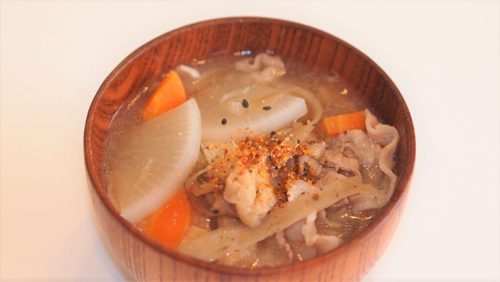 気温が低くなってきて豚汁がおいしい季節になってきました!だしパックを使って簡単に出汁をとれば、在り来りの材料でも、出汁が薫る一枚上手の豚汁が出来ます!レギュラーメンバーの大根からも美味しい出汁が取れますので味噌汁とは一味違う美味しさがあ... -