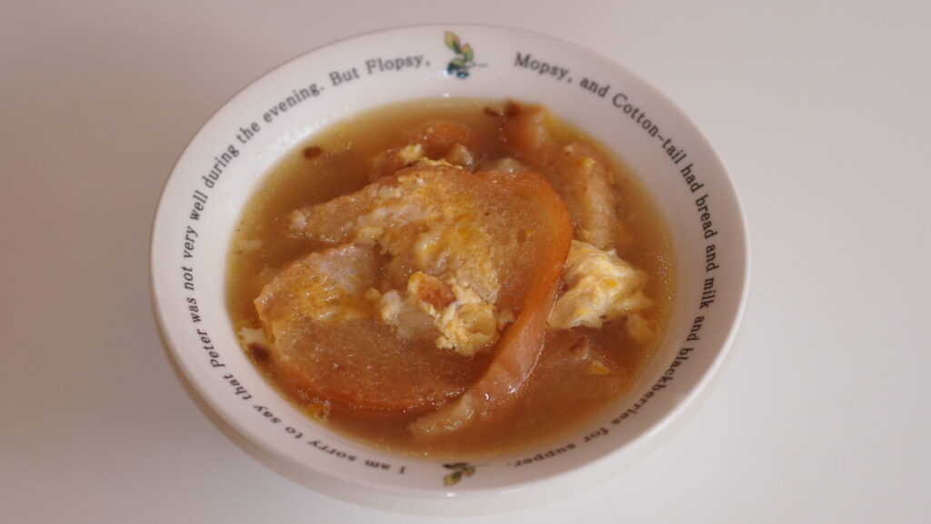 ガーリックのメニュー続きで恐縮です。ガーリック好きなので(笑) このスープは、ガーリックとコンソメの薫りが重なり、更にフランスパンのトーストの薫りとのコンビネーションが最高です。こんなに簡単なのにレストランのスープの味わいです。パンが浸して...